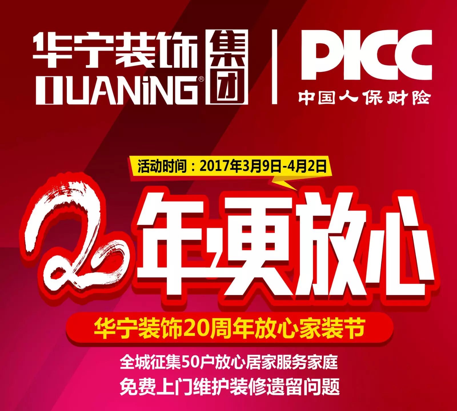 活动签单客户均可享受华宁装饰集团合作伙伴中国人民财产保险(PICC)提供的三年家庭装修保险,保额70万元。(水管爆了?天花掉漆了?电器漏电了?我们赔!甚至家里被偷被抢了,我们也都通通赔!)